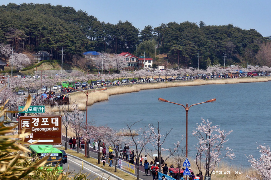 Bãi biển Gyeongpo là bãi biển lớn nhất ở bờ Đông Hàn Quốc, chỉ cách khu du lịch Gyeongpodae Pavilion, địa điểm nổi tiếng để ngắm mặt trời mọc 1km. Đây cũng là một trong những bãi biển đẹp, thu hút nhiều khách du lịch vào mùa hè. Nhưng đặc điểm nổi bật nhất của bãi biển Gyeongpo là con đường hoa anh đào chạy dọc bờ biển. Nhằm phục vụ nhu cầu ngắm cảnh của người dân, những con đường lát gỗ được dựng ngay dưới chân những hàng cây, giúp khách du lịch vừa chụp ảnh, thưởng hoa vừa có thể ngắm cảnh biển.