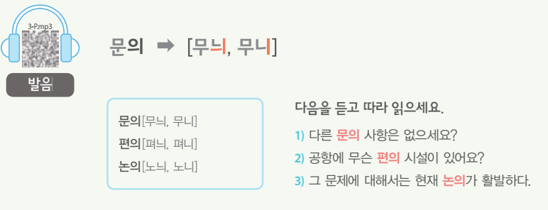 (1) Khi là âm tiết đầu tiên của từ thì được phát âm là [의]. 의사 [의사]