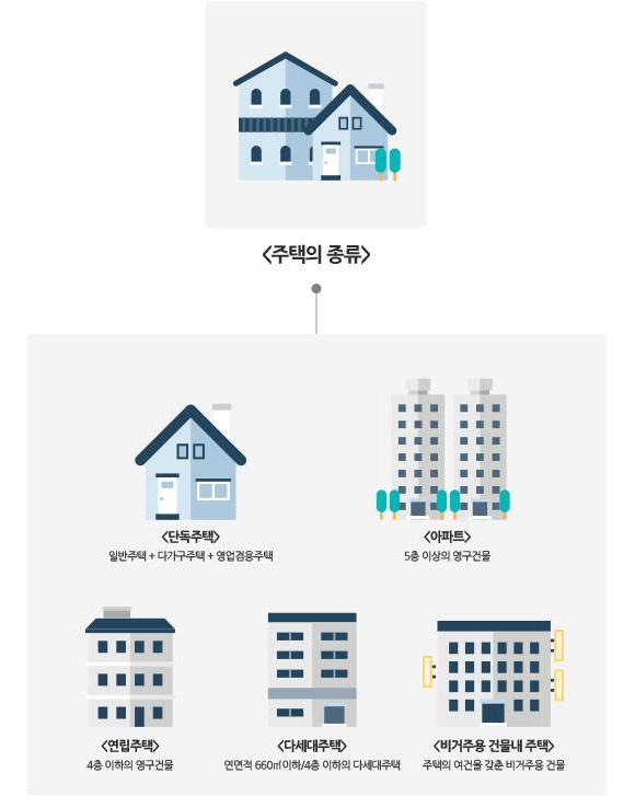 한국에서의 일반적인 주거 형태로는 단독주택, 아파트, 오피스텔, 다세대, 다가구 주택 등이 있다. 요즘 도시에서 사는 한국 사람들은 생활의 편리함을 위해 아파트 등의 공동 주택에 사는 것을 선호 한다. 한국 사람들은 주택을 소유하는 것에 대하여 큰 의미를 두고 있다. 한국에서 주택 가격은 매우 비싼 편이며, 농촌보다 도시의 집값이 훨씬 비싸다.